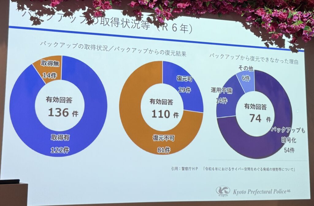 バックアップから復元できなかった理由ですが、「バックアップも暗号化されていた」という理由が74件中54件という結果でした。